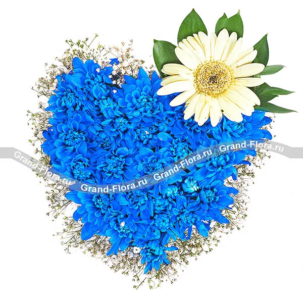 Уменьшенный: хризантема кустовая синяя (окрашенная) - 4 шт, гербера белая - 1 шт, гипсофила - 2 шт, рускус, оазис сердце.