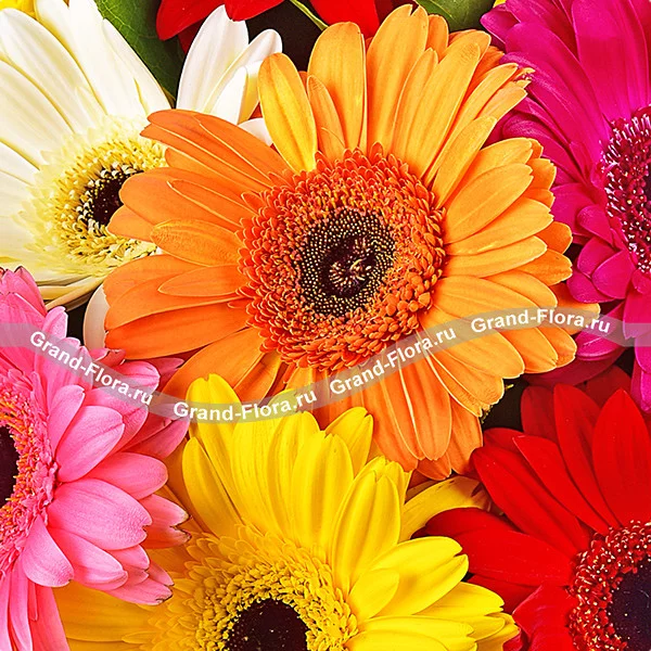 поможет солнечное сочетание пестрых гербер. Нежно розовый цвет намекнет о симпатии, желтый о дружеском интересе, оранжево-красный станет комплиментом, а насыщенно-розовый